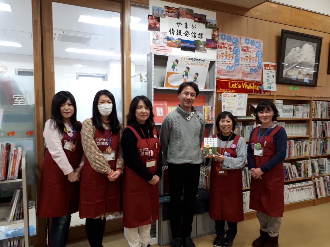 最後は、ひだまり図書館職員とハイポーズ♬笑顔の素敵な丹野氏に、私たちも元気をいただきました。
