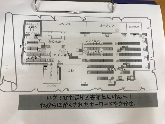「たんけん!」ということで、図書館の中を地図にしたものに宝の場所を印し、