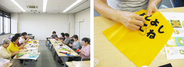 さて、図書館は職員だけでなく様々なボランティアの方にも支えられています。 こちらはパッチワーク教室のみなさまです。 図書館に布の絵本をご寄贈いただけるとのことで、制作風景を撮影させていただきました。