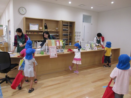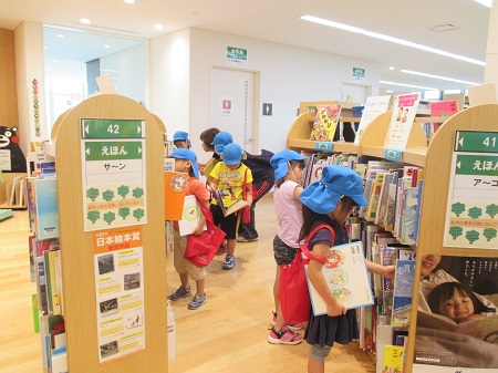 図書館のたくさんの絵本の中から2冊選んで貸し出しです。