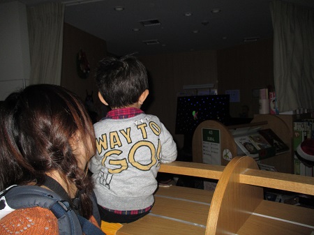 楽しい手あそびの後は、えほんのへやを少し暗くして