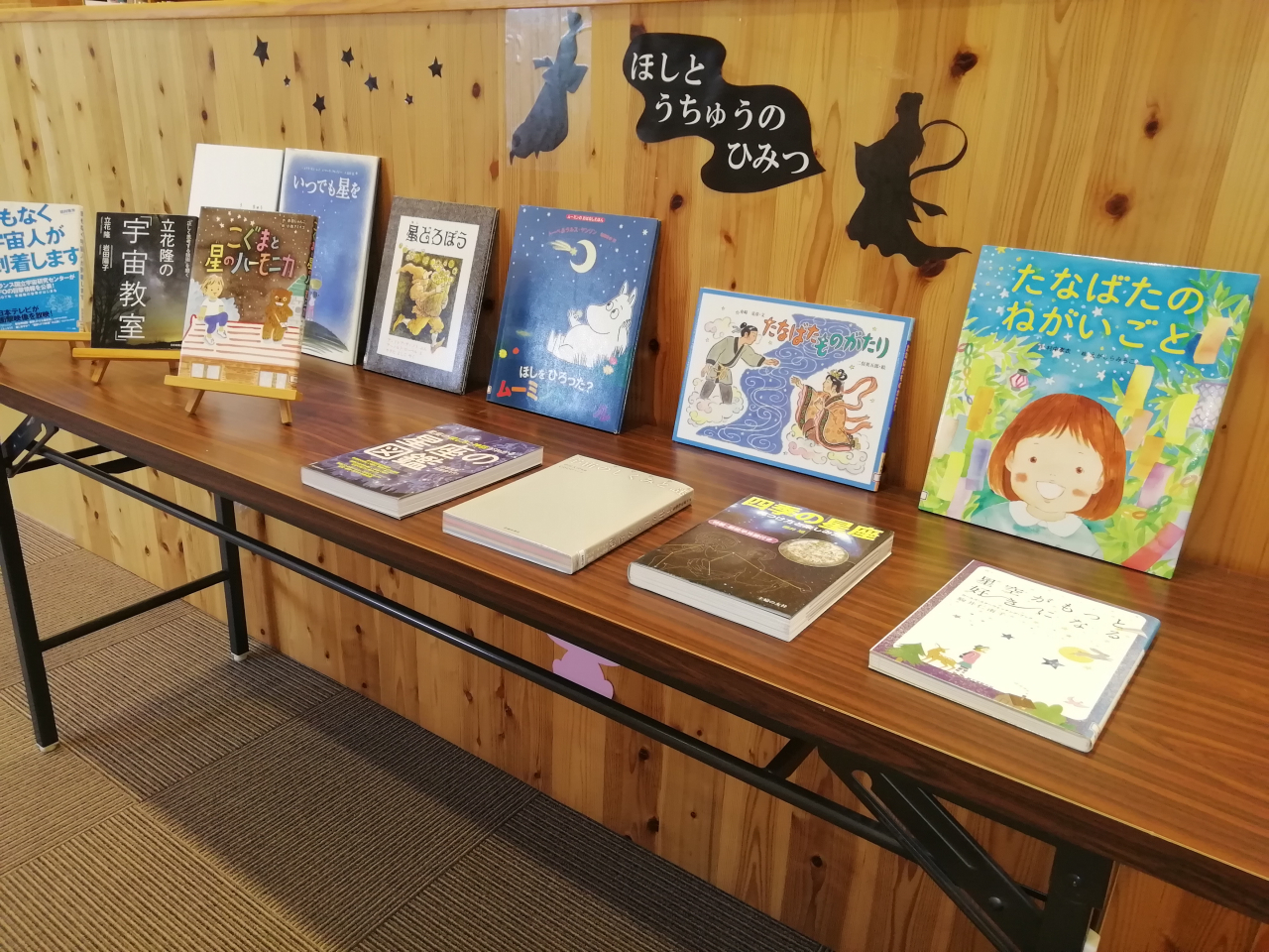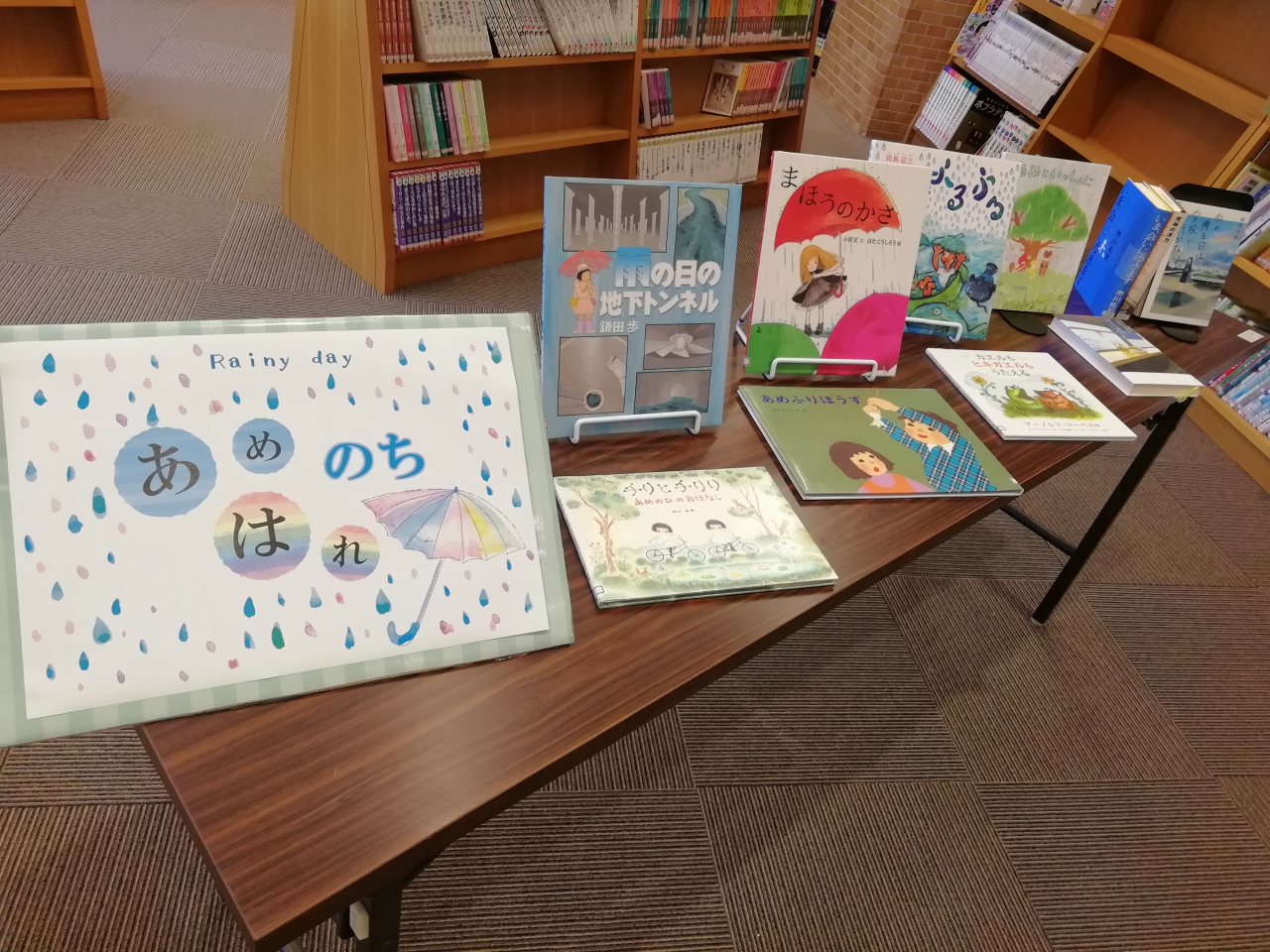 雨のときに読みたい本を絵本から小説まで展示しています。