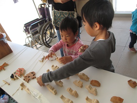 遊べる木のおもちゃで楽しそうに遊ぶ子どもたち・・・。