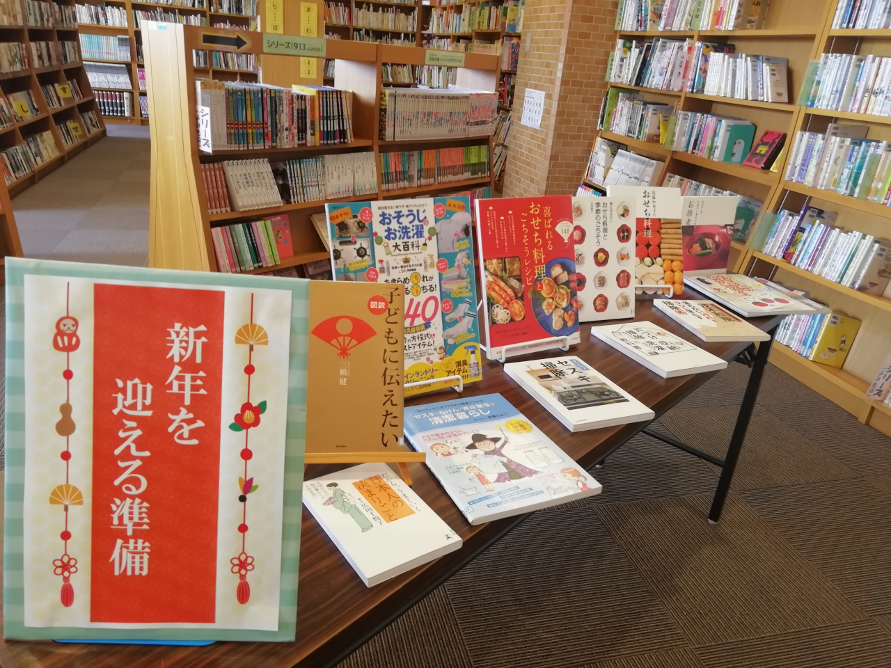 暮れに読みたい『かさこじぞう(かさじぞう)』も展示しています。