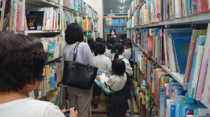 普段は入れないエリア(閉架)に入ったり、本の並んだ棚の説明を聞いたりしながら