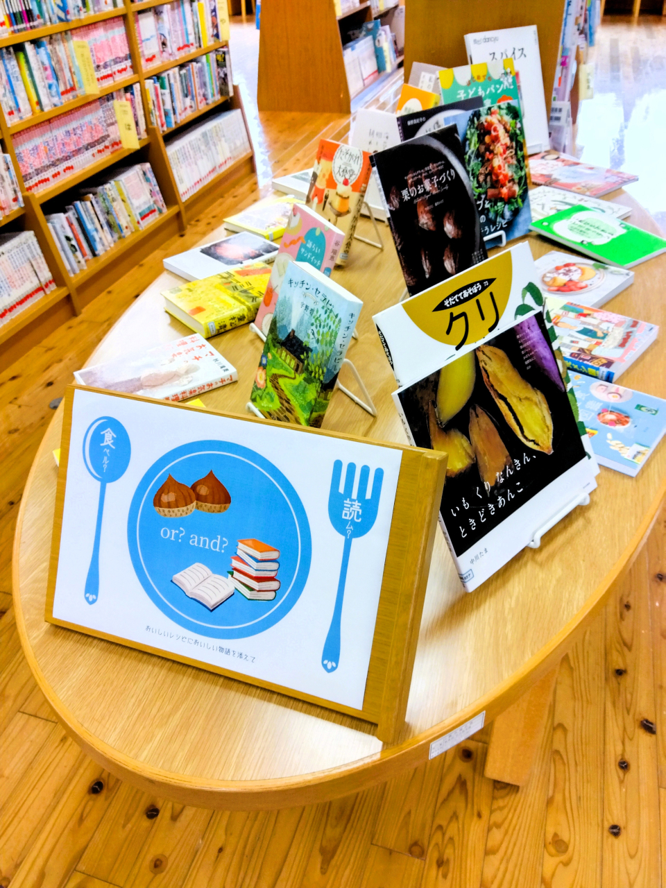 栗レシピのほか、子どもも一緒に料理ができるレシピや、読んでおいしい物語の本を展示しています。