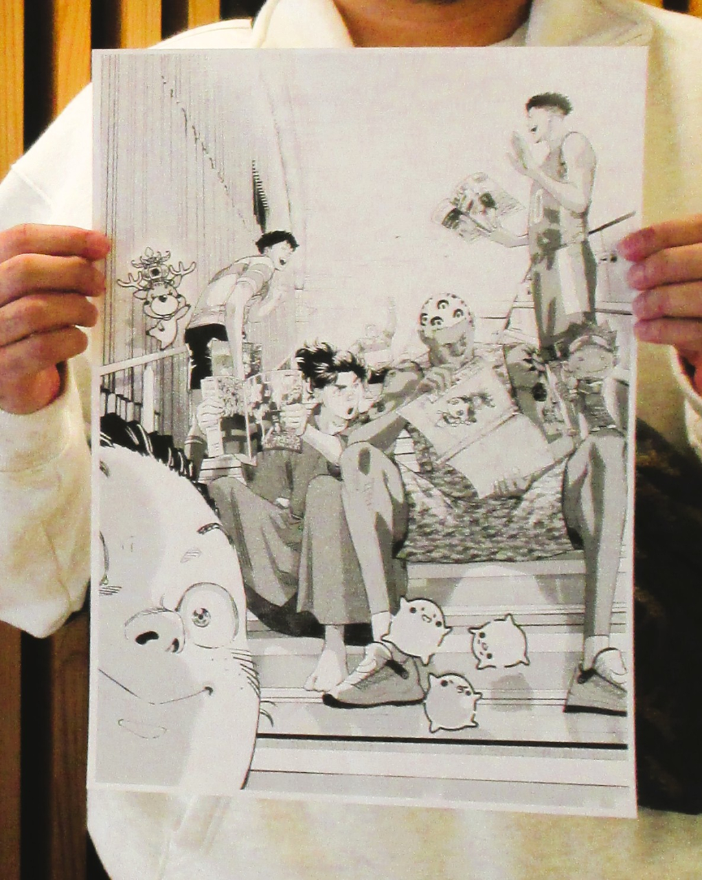 飛松さんの作品の登場人物と、山鹿市に縁のあるキャラクターたちが大集合!